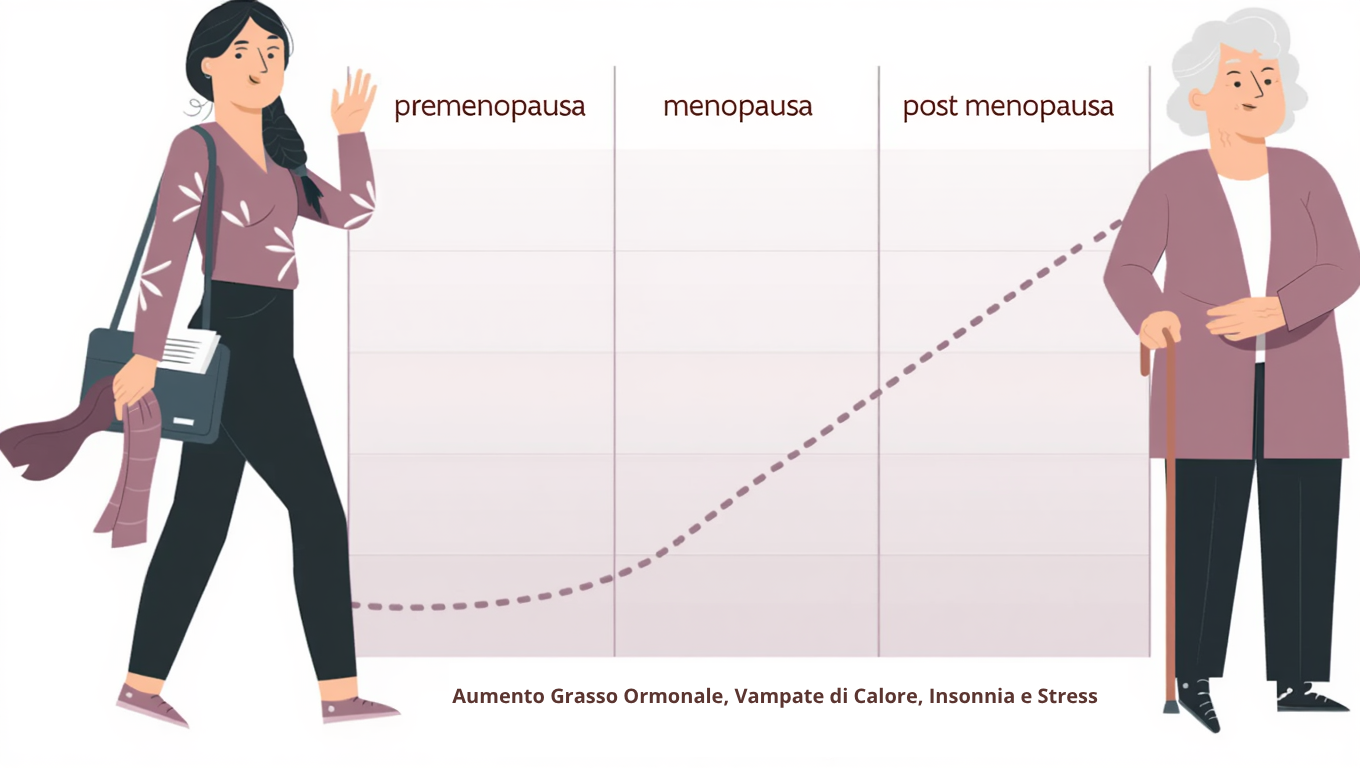 Durante le fasi della menopausa, il calo ormonale altera metabolismo, sonno, umore ed energia, causando grasso addominale, vampate di calore e stress difficili da controllare.